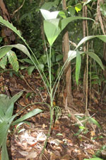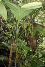 | Field notes | Solitary understory palm. Stem 1.5 m high, 2 cm thick. Roots few visible. Leaves 11; sheath 15 cm long, closed; petiole 41 cm long; rachis 28 cm long; lamina entire, 50 cm long, 22-23 cm wide, flat. Inflorescence infrafoliar; prophyll 15 cm long, 1.3 cm wide, herbaceous; peduncle 15 cm long; rachis 7 cm long; rachillae 10, 13-19 cm long. Flowers green. Silica gel sample taken. Transect: HB 1051 |