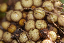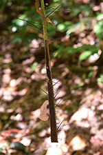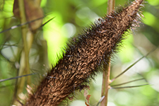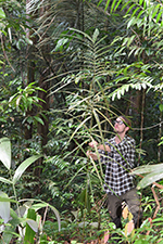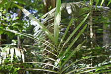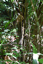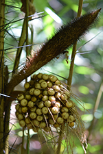 | Field notes | Cespitose understory small palm with few visible roots. Stem 2 m long and 4 cm diam; internodes 5 cm long, longer than stem diameter, smooth, brown. Crownshaft absent. Leaves 13 per stem; sheaths open, 30 cm long, with 10 cm long, black spines; petiole round in cross-section, 100 cm long with 10 cm long, black spines; rachis 120 cm with 8 cm long black spines; lamina pinnate 80 cm wide, 130 cm long, bushy, with 22 segment per side in groups of 3-4, basal pinna 40 cm long, middle pinna 60 cm long. Infructescence interfoliar; peduncular bract 30 cm, woody, brown with 1 cm long, brown spines; rachis 10 cm, less than 1 cm wide; rachillae many; fruits green with 2 mm long brown spines. |
