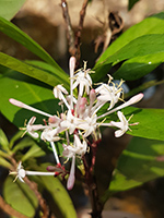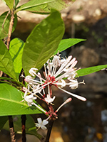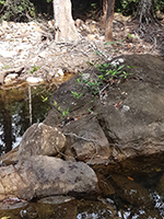 Field notes bush, 1 m tall, white wih pink ish flower, grow on big rock in stream