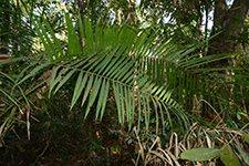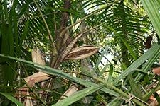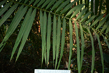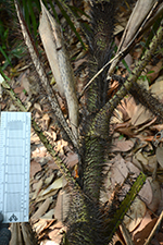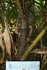 | Field notes | Clustering palm, erect, ca 4 m tall, perhaps climbing when larger. Stem 6 cm diameter, leaf sheath pale green with black spines to 4 cm long, grouped in partial whorls, with pale swollen base. Leaf ca 350 cm, petiole 40-60 cm, rachis ca 300 cm incl. 40 cm cirrus. 60 pinnae/side, regular but not neatly in pairs, in one plane. Male inflorescence on short peduncles, peduncular bracts not enclosed in prophyll |