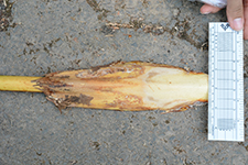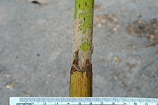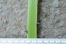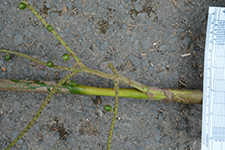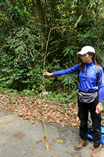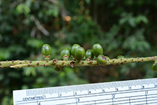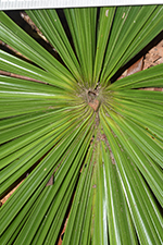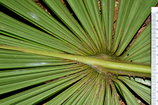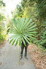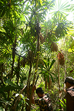 | Field notes | Clustering palm to 5m tall, stem 9 cm diameter, internodes brown, 5 cm, nodal scars inconspicious, <1 cm. 16 leaves in crown, palmate, old leaves somewhat persistent. Leaf sheath 9 cm wide, 25 cm long, dusty olive green, keeled, margins disintegrating into net-like fibres. Petiole 150 cm with black recurved spines. Lamina sub-circular, split into 12 segments per side. Mid segment 80 cm, basal segment 50 cm. 2-5 fold, splitting between folds. Inflorescences interfoliar, branched to 2 orders. Prophyll ivory with brown indumentum, 20-40 cm long, 7 cm wide. 15-35 cm between 1st order branche, Bracys dark to pale green with whitish-brown indumentum. 1st order branches 15-35 cm long, rachillae 10-30 cm, sparsely covered with whitish indumentum. Fruit ovoid, glossy green, 8 x7 mm. |