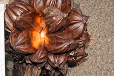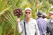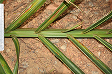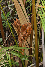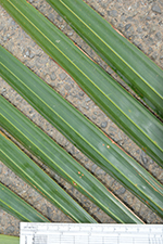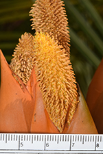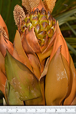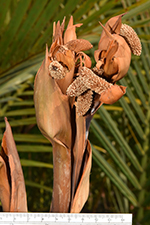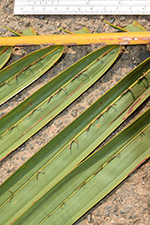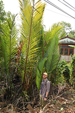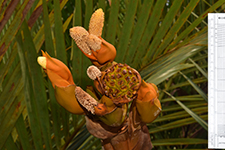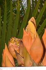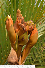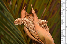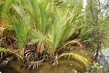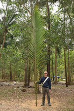 | Field notes | Clustering, acaulescent mangrove palm. 6-10 leaves in crown, regularly pinnate, to 8 m long, somewhat arching. Pinnae 40-60 per side, slightly ascending, bright green, abaxially with ramenta. Inflorescences bisexual, female apically, male on lateral branches with up to 20 bracts per inflorescence. Lowest bract dark green, fleshy, other bracts pale brown, leathery. Bracts up to 45 cm long. Up to 7 male lateral branches, each branching up to 6 times, presenting radillae at same level as female flowers. Visited by stingless bees at 10:30. Infructescence 20 cm tall and 25 cm wide, with up to 70 fruits. Fruits 5-10 cm at widest point, 2-5 at slimmest point, ca 10 cm long. Flat with raised edges |