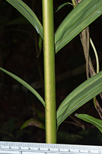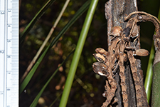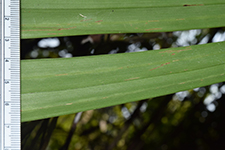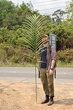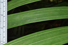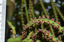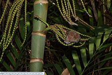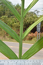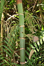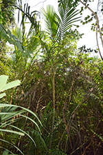| Field notes | Clustering understory palm, stem 4 m incl. crownshaft of ca 150 cm, 4 cm in diameter. Internodes 12-20 cm, fresh green with sparse white firmly attached indumentum. Nodal scars ca 1 cm, pale brown. Leaf sheaths pale green, covered in dense rusty-red indumentum that rubs off easily, closed, 60 cm long. Leaf 3.5 m, pinnate. Petiole 120 cm, rachis 210 cm. Pinnae 2(-3) fold, regular, somewhat sigmoid, slightly ascending, inconspicuously mottled, 24 per side. Inflorescences infrafoliar, branched to 1 order, 7-9 rachillae, 12-25 cm long, bright green with sparse white indumentum, flowers somewhat sunken in pits, red, appearing distichious. Bract 15x6 cm, chestnut brown with sparse indumentum, fallen at anthesis. Habitat: edge of seasonally dry swamp. |