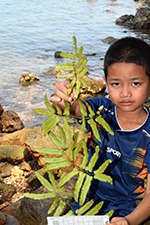 Koh Chang. Salakok village, edge of sea w. mangrove & hill edge to sea. Rocky coast
