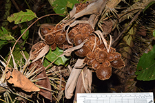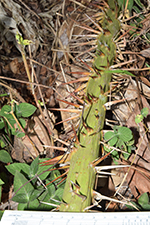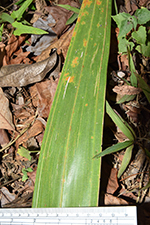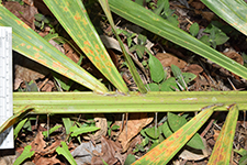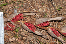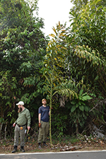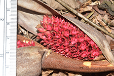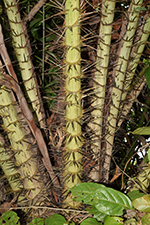 | Field notes | Acaulescent palm with leaves to 7-8 m long. Petiole ca. 2 m, ca. 45 leaflets per side, in grouops of 3-5, cucullate, spreading in different planes, to 65 cm long, 9 cm wide. Apex multifold. Petiole armed with collars of fierce, brown-black spines to 9 cm. Grooved with imprints of spines. Rachis armed with groups of spines abaxially. Inflorescence higlyy branched with many light brown, leathery bracts. Emerging 7125 cm from crown. 5 partial inflorescences with 5-8 rachillae each. Female flowers bright red. |