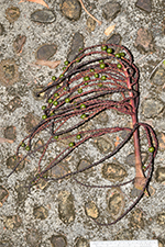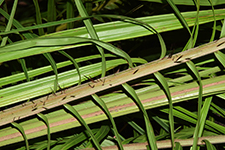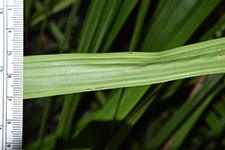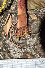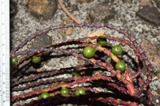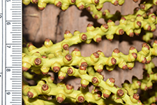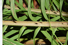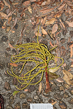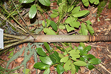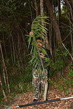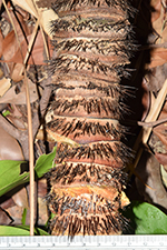 | Field notes | Single stemmed palm; 10 m tall. Stem 5 cm wide. Internodes grey, 2 cm long, armed with <2cm long glossy brown spines espicially in the uppermost 25 cm of the stem. Crownshaft 60 cm long, 6 cm wide. 11 leaves in crown. Leaf sheaths greyish-green with appressed glossy brown spines. Leaf 170 cm ca 50 drooping pinnae per side. Petiole 15 cm, abaxially covered with 3 cm long black-brown spines. Rachis 155 cm. Inflorescences infrafoliar, branching to 2 orders, rachis <28 cm long, burgundy. Remaining inflorescence yellow-green. First-order branches <3 cm long, radillae <32 cm long. Calyx yellow-green, corolla and ovary brown in female flowers after anthesis. Infructescence dark burgundy to deep purple-black. Fruit globose, ca. 1 cm diameter, olive green. |