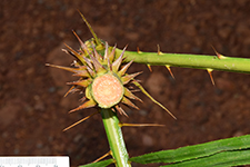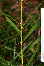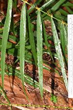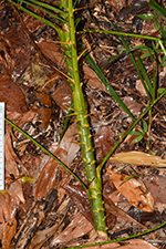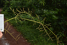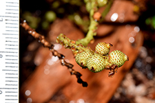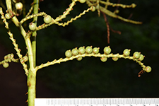 | Field notes | Liana palm 7 m high. Stem 2 cm diam. Sheath- spines flat, yellow-green horisontal to 4 cm long. Lvs ca 20; petiole c. 10 cm with yellow brown spines. Petiole-spines perpendicular. Lamina up to 130 x 50 cm, pinnae to 50 per side, pointing in different directions, irregularly inserted. Cirrus inserted on side of sheath to 130 cm long. Inflorescence emerging from leaf sheath, to 1 m (+) long with 4-5 rachillae that are divided once. Inflorescence with 1 m long cirrus at apical rachilla |
