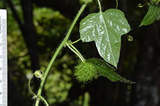 Climber, sepals geen, petals white, corona purple on basal half white on distal half
