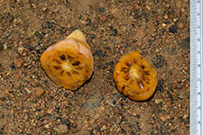 Tree 10 m tall, fruit covered by yellow-organge calyx.