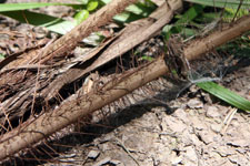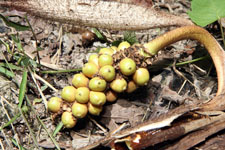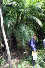 | Field notes | Colonial understory palm. Stem 3m long, 3-5cm thick; spines 4cm long, black. Leaves 4 per stem; sheath 35cm, open; petiole 40cm, round, brown; rachis 190cm; lamina 220 x 140cm; pinnae 51 per side, basal 48cm, middle 70cm, apical 30cm. Peduncular bract 40cm long, woody, brown; peduncle 30 cm long, 2cm thick; rachis 15cm, unbranched. Transect HB326-wayout |
