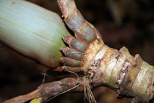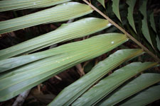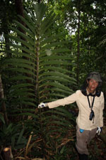 | Field notes | Solitary tree palm. Stem 7m long, 6.5cm thick; crownshaft 65cm long. Leaves 6 per stem; sheath 20cm, closed; petiole 27cm, round; rachis 199cm; lamina 210 x 115cm; pinnae 25 per side, basal 26cm, middle 60cm, apical 26cm. Peduncular bract 16cm, soft, brown; peduncle 14cm, 2cm thick; rachis 11cm, unbranched. Transect HB328-outside subunit 60. |