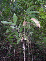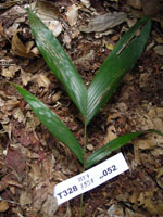 | Field notes | Cespitose understory palm. Stem 1.5m long, 1.2cm thick; spines 0.2cm long, black. Leaves 6 per stem; sheath 9cm, open; petiole 23cm, green; rachis 19cm; lamina 42 x 40cm; pinnae 2 per side, basal 38cm, apical 38cm long. Peduncular bract 7cm long, brown; peduncle 2.5cm, 0.3cm thick; rachis branched to 1st order; rachillae 2, 4cm long, 0.1cm thick. Transect HB328-SU60 |
