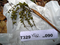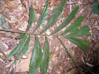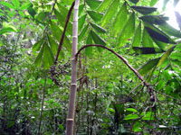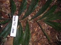 | Field notes | Understory palm. Roots 20, 27cm long, 0.7cm thick. Stem 2.5m long, 3cm thick; crownshaft 23cm long. Leaves 6 per stem; sheath 24cm long, closed; petiole 32cm long, round; rachis 43cm long; lamina 61 x 63cm; pinnae 6 per side, basal 22cm, middle 34cm, apical 24cm. Peduncular bract 32cm long, light brown; peduncle 29cm, 0.6cm thick; rachis 16cm, branched to 1st order; rachillae 11, 15cm long, 0.2cm thick. Transect HB328-SU90 |