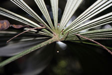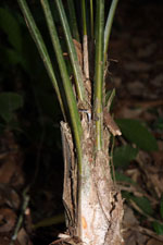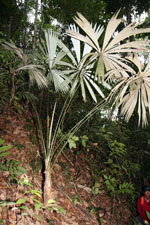 | Field notes | Low understory fan-palm. Stem 0.3 m long, 12cm thick. Leaves 11 per stem; sheath 25cm, open; petiole 190cm, margined, green; lamina palmate, 130cm wide with 15 leaf segments. Sterile voucher. Transect HB328-outside of transect. |