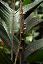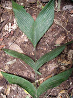 | Field notes | Acaulescent rosette palm. Leaves 7 per rosette; sheath 12cm, margined; petiole 75cm, green; rachis 57cm; lamina 83 x 62cm; pinnae 3 per side; basal 40cm, middle 34cm, apical 40cm. Peduncular bract 20cm, brown; peduncle 70cm long, 0.4cm thick; rachis 21cm long, unbranched. Transect HB330-SU5 |