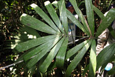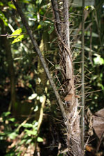| Field notes | Cespitose understory palm. Stem 1.4m long, 4cm thick. Leaves 10 per stem; sheath 23cm, open; petiole 85cm, round, green; rachis 105cm; lamina 135 x 88cm; pinnae 19 per side, basal 46cm, middle 50cm, apical 32cm. Inflorescence infrafoliar; peduncular bract 30cm long, woody, spiny; peduncle 21cm long, 1cm thick, smooth; rachis branched to 1st order; rachillae 2, 6cm long. Transect HB331-SU27. |