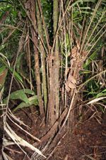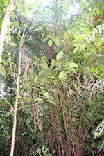 | Field notes | Cespitose understory palm. Stem 5m long, 5cm thick, spines. Petiole 115cm, brown; rachis 165cm; lamina 194 x 80cm; pinnae 28 per side, basal 38cm, middle 48cm, apical 34cm. Inflorescence interfoliar; prophyll 17cm, 5cm wide; peduncular bract 40cm long, woody, dark brown, inserted 11cm from base, spiny; peduncle 22cm long, 4.5cm thick, spiny; rachis 12cm long, branched to 1st order; rachillae 14cm, 0.1cm thick; flowers sessile. Transect HB332-SU15 |