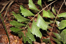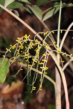 | Field notes | Cespitose understory palm. Roots 0.5cm thick. Stem 3m long, 2cm thick. Leaves 4 per stem; petiole 21cm, round, brown; rachis 50cm; lamina 62 x 37cm; pinnae 8 per side, basal 12cm, middle 23cm, apical 15cm. Inflorescence infrafoliar; prophyll 10cm long; peduncular bract 36cm long, soft, brown; peduncle 41cm long, 0.8cm thick; rachis 10cm long, branched to 1st order; rachillae 16, 15cm long, 3cm thick; flowers sessile. Transect HB332-SU100. |