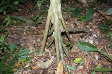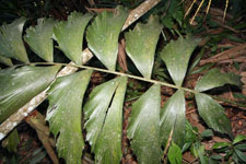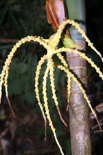 | Field notes | Solitary tree palm. Stiltroots 10, 65cm long, 5.5cm thick. Stem 10m long, 9cm thick. Leaves 7 per stem; sheath 20cm, closed; petiole 67cm, round, green; rachis 210cm; lamina 228 x 125cm; pinnae 12 per side, basal 54cm, middle 85cm, apical 32cm. Inflorescence infrafoliar; peduncular bract 17cm long; peduncle 18cm long, 3cm thick; rachis 10cm long, branched to 1st order; rachillae 9, 38cm long, 1.2cm thick; flowers sessile, yellow. Transect HB333-wayin. |
