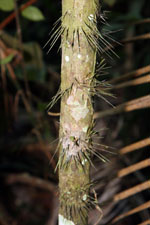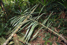 | Field notes | Understory palm. Stem 5m long, 5cm thick; spines 4cm long, black-brown. Leaves 9 per stem; sheath 56cm, open; petiole 30cm, green; rachis 145cm; lamina 157 x 130cm; pinnae 45 per side, basal 52cm, middle 64cm, apical 28cm; peduncular bract 40cm long; peduncle 25cm long, 3cm thick; rachis 8cm long, branched to 1st order; rachillae 60, 12cm long, 0.1cm thick; flowers sessile. Transect HB333-wayin. |