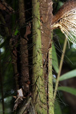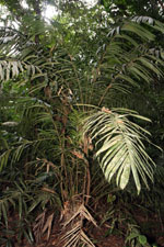 | Field notes | Cespitose understory palm. Stem 1.6m long, 6cm thick; spines 2cm long. Leaf spines 7 cm long, black; sheath 50cm, closed; petiole 68cm, round, green; rachis 180cm; lamina 192 x 114cm; pinnae 39 per side, basal 44cm, middle 60cm, apical 30cm. Inflorescence interfoliar; peduncular bract 20cm, woody, spiny, brown, inserted at base; peduncle 8cm long, 2cm thick, spiny; rachis 6cm long, branched to 1st order; rachillae 200, 8cm long, 0.1cm thick; flowers sessile. Transect HB334-outside SU35 |