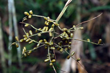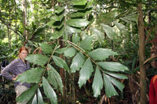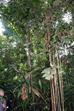 | Field notes | Understory palm. Roots 20, 17cm long, 0.4cm thick. Stem 3.5m long, 1.5cm thick; crownshaft 20cm long. Leaves 5 per stem; sheath 24cm, closed; petiole 42cm, round, brown; rachis 59cm; lamina 66 x 46cm; pinnae 6 per side, basal 19cm, middle 29cm, apical 15cm. Infructescence infrafoliar; peduncular bract 15cm long, soft, brown, inserted at the base; peduncle 29cm long, 0.6cm thick, smooth; rachis 6cm long, branched to 1st order; rachillae 9, 21cm long, 0.2cm thick; fruits sessile. Transect HB335-SU01 |