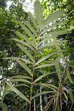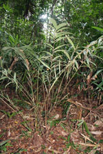 | Field notes | Acaulescent palm. Leaves 8 per stem; sheath 31cm, open; petiole 47cm, round, green; rachis 93cm; lamina 118 x 69cm; pinnae 13 per side, basal 46cm, middle 51cm, apical 34cm. Prophyll 7cm long; peduncle 11cm long, 0.6cm thick, smooth; rachis 5cm long, branched to 1st order; rachillae 15, 3cm long, 0.1cm thick. Transect HB335-SU37. |