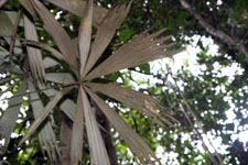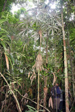 | Field notes | Fan-palm. Stem 6m long, 6cm. Leaves 16 per stem; sheath 14cm, open; petiole 84cm, margined, green; rachis 10cm; lamina palmate, 57 x 103cm; segments 5 per side, basal 46cm, middel 54cm, apical 55cm. Sterile voucher. Transect HB335-outside SU50. |