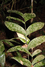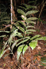 | Field notes | Acaulescent rosette-palm. Leaves 8 per rosette; sheath open; petiole 96cm, green; rachis 36cm; lamina 49 x 38cm; pinnae 4 per side, basal 22cm, middle 24cm, apical 21cm. Prophyll 8cm long; peduncular bract 20cm long, soft, hairy, brown; peduncle 70cm long, 0.3cm thick; rachis 12cm long, 0.8cm thick, unbranched; flowers sunken, white. Transect HB336-SU1. |