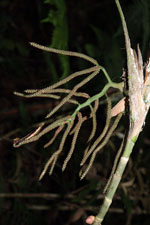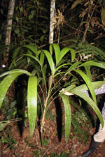 | Field notes | Cespitose palm. Stem 4m long, 2.5cm diam. Leaf-sheath 28cm, open; petiole 50cm, margined, green; rachis 41cm; lamina 89 x 86cm; pinnae 5 per side, basal 76cm, middel 76cm, apical 74cm. Inflorescence infrafoliar; peduncular bract 16cm long, soft, smooth, brown, inserted at the base; peduncle 13cm long, 1.5cm thick; rachis 18cm long, branched to 2nd order; rachillae 12, 17cm long; flowers sunken. Transect HB336-SU25. |
