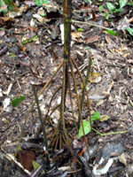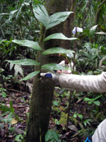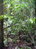| Field notes | Solitary palm. Roots 20, 20cm long, 0.4cm thick. Stem 1m long, 1.5cm thick. Leaves 5 per stem; sheath 18cm, closed; petiole 38cm round, green; rachis 45cm; lamina 62 x 45cm; pinnae 5 per side, basal 26cm, middle 26cm, apical 24cm. Innfructescence infrafoliar; peduncular bract 19cm long, brown, inserted at the base; peduncle 39cm long, 0.4cm thick, smooth; rachis 3.5cm long, branched to 1st order; rachillae 6, 10cm long, 0.3cm thick; fruits sessile. Transect HB337-SU33. |