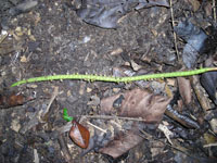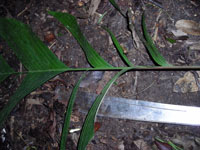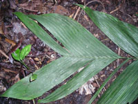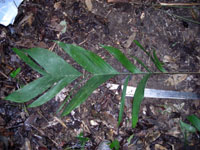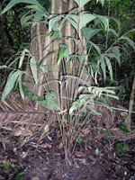 | Field notes | Solitary understory palm. Roots 8, 20cm long, 0.2cm thick. Stem 0.3m long, 3cm thick. Leaves 11 per stem; sheath 37cm, closed; petiole 70cm margined, green; rachis 70cm; lamina 95 x 48cm; pinnae 4-6 per side, basal 36cm, middle 33cm, apical 30cm. Inflorescence interfoliar; prophyll 26cm; peduncular bract 38cm long, soft, brown, inserted at the base; peduncle 59cm long, 0.4cm thick; rachis 32cm long, unbranched; flowers sunken, white. Transect HB338-SU08. |