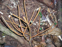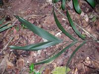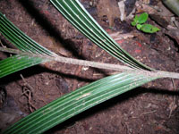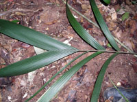 | Field notes | Cespitose palm. Stem 2.5m long, 2cm diam. Leaves 11 per stem; sheath 20cm, closed; petiole 30cm, margined, green; rachis 38cm; lamina 80 x 80cm; pinnae 3 per side, basal 58cm, middel 63cm, apical 56cm. Inflorescence interfoliar; peduncular bract 12cm long, woody, brown, inserted at the base; peduncle 9cm long, 1cm thick; rachis 5cm long, branched to 2nd order; rachillae 9, 9cm long. Transect HB339-outside SU35. |