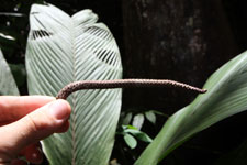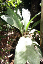 | Field notes | Acaulescent rosette-palm. Leaves 11 per stem; sheath 17cm, open; petiole 38cm, margined, green; rachis 80cm; lamina 100 x 36cm, entire. Inflorescence interfoliar; peduncular bract 32cm long, brown; peduncle 72cm long, 1cm thick, smooth; rachis 26cm long, unbranched. Transect HB339-SU45. |