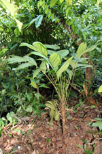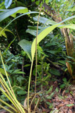 | Field notes | Solitary palm. Stem 0.3m long, 3cm thick. Leaves 12, sheath 19cm, closed; petiole 30cm, green; rachis 42cm; lamina 52 x 40cm; pinnae 3 per side, basal 30cm, middle 28cm, apical 20cm. Inflorescence interfoliar; prophyll 22cm; peduncular bract 26cm long, soft, brown; peduncle 54cm long, 0.5cm thick, smooth; rachis 27cm long, unbranched; flowers sunken. Transect HB339-SU69. |