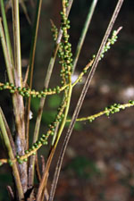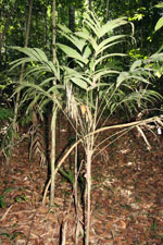 | Field notes | Solitary palm. Stem 1m long, 2cm thick. Leaves 15 per stem; sheath 20cm, closed; petiole 43cm, green; rachis 58cm; lamina 90 x 48cm; pinnae 6 p er side, basal 41cm, middle 45cm, apical 48cm. Inflorescence interfoliar; prophyll 5cm long; peduncular bract 16cm long, soft, brown, inserted 15cm from base; peduncle 29cm long, 0.5cm thick, smooth; rachis 5cm long, branched to 1st order; rachillae 6, 14cm long, 0.2cm thick; flowers sunken. Transect HB340-SU62. |