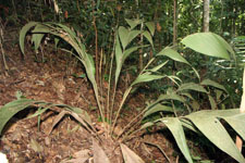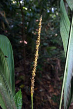 | Field notes | Acaulescent palm. Leaves 10 per stem; sheath 19cm long, closed; petiole 60cm, margined, green; rachis 105cm; lamina 149 x 46cm; pinnae 3 per side, basal 50cm, middle 45cm, apical 47cm. Inflorescence interfoliar; prophyll 15cm long; peduncular bract 40cm long, soft, brown; peduncle 100cm long, 0.5cm thick; rachis 27cm long, 1cm thick, unbranched; flowers sunken. Transect HB340-SU76. |
