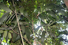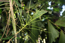 | Field notes | Cespitose, understory palm. Stem 2m long, 1.5cm thick; crown-crownshaft 98cm long. Leaves 7 per stem; sheath 18cm, closed; petiole 22cm, margined, green; rachis 50cm; lamina 77 x 40cm; pinnae 5 per side, basal 40cm, middle 42cm, apical 36cm. Inflorescence infrafoliar; peduncular bract 30cm long, brown, inserted 1cm from base; peduncle 4cm long, 0.4cm thick, smooth; rachis 8cm long, branched to 1st order; rachillae 25, 19cm long, 0.1cm thick. Transect HB341-SU71. |