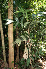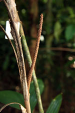 | Field notes | Cespitose, understory palm. Stem 2m long, 1.5cm thick. Leaf-sheath 17cm, closed; petiole 27cm, margined, green; rachis 30cm; lamina 38 x 42cm; pinnae 3 per side, basal 28cm, middle 32cm, apical 28cm. Inflorescence infrafoliar; prophyll 10cm long, soft, brown; peduncle 8cm long, 0.5cm thick; rachis 22cm long, 0.6cm thick, unbranched; flowers sunken. Transect HB341-SU75. |