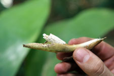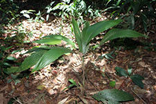 | Field notes | Understory palm. Stem 0.1m long, 1cm thick. Leaves 9 per stem; sheath 15cm, closed; petiole 18cm, green; rachis 26cm; lamina 46 x 30cm, entire. Prophyll 6cm long; peduncular bract 10cm long, green, inserted at the base; peduncle 5cm long, 0.5cm thick; rachis 3(+)cm long, unbranched. Transect HB342-SU11. |