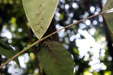 | Field notes | Juvenile liana palm. Stem 0.3m long, 1cm thick; spines 6cm long, black. Leaves 6 per stem; sheath 8cm long, closed; petiole 25cm, round, green; rachis 40cm; lamina 65 x 55cm; pinnae 3 per side, basal 30cm, middle 30cm, apical 32cm. Sterile voucher. Transect HB342-SU47. |