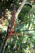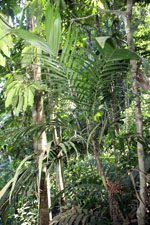 | Field notes | Erect understory palm. Stem 3m long, 2.5cm thick. Leaves 12 per stem; sheath 26cm, closed; petiole 22cm, margined, green; rachis 83cm; lamina 102 x 80cm; pinnae 14 per side, basal 47cm, middle 47cm, apical 37cm. Infructescence infrafoliar; peduncular bract 26cm long, brown, inserted 2.5cm from base; peduncle 6cm long, 0.8cm thick, smooth; rachis 11cm long, branched to 1st order; rachillae 30, 18cm long, 0.2cm thick; fruits sessile. Transect HB342-SU91. |