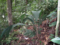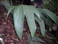 | Field notes | Acaulescent, understory, roosette-palm. Leaves 12 per stem; sheath 19cm long, open; petiole 39cm, margined, green; rachis 52cm; lamina 92 x 39cm; pinnae 2 per side, basal 30cm, apical 42cm. Sterile voucher. Transect HB343-SU08. |
