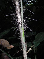 | Field notes | Juvenile liana palm. Stem 2.5m long, 4.5cm thick; spines 6cm long, black. Leaves 16 per stem; sheath 6cm long, closed; petiole 18cm, round, green; rachis 58cm; lamina 115 x 32cm; pinnae 5 per side, basal 17cm, middle 25cm, apical 20cm. Sterile voucher. Transect HB343-SU13. |