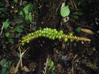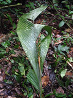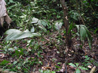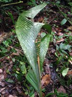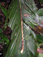 | Field notes | Acaulescent, rosette-palm. Leaves 7 per stem; sheath 20cm long, open; petiole 50cm, margined, green; rachis 70cm; lamina 97 x 36cm; pinnae 3 per side, basal 28cm, middle 25cm, apical 30cm. Infructescence interfoliar; prophyll 9cm long; peduncular bract 30cm long, brown, inserted at the base; peduncle 90cm long, 0.5cm thick, smooth; rachis 22cm long, 1cm thick, unbranched; flowers sunken. Transect HB344-SU21. |