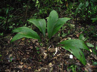 | Field notes | Solitary understory palm. Stem 0.1m long, 1cm thick. Leaves 5 per stem; sheath 14cm, closed; petiole 18cm margined, green; rachis 36cm; lamina 54 x 30cm, entire. Infructescence interfoliar; peduncular bracts 3, 5.5cm long, soft, brown; peduncle 19cm long, 0.2cm thick, smooth; rachis 16cm long, 0.3cm thick, unbranched; fruits sessile. Transect HB344-SU25. |