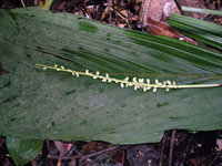 | Field notes | Solitary understory palm. Stem 0.6m long, 2cm thick. Leaves 5 per stem; sheath 18cm, closed; petiole 40cm margined, green; rachis 60cm; lamina 90 x 30cm, entire. Infructescence interfoliar; peduncular bracts 3, 13cm long, soft, brown; peduncle 44cm long, 0.2cm thick, smooth; rachis 27cm long, 0.3cm thick, unbranched; fruits sessile. Transect HB344-SU53. |