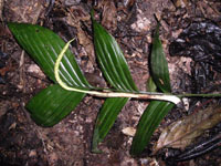 | Field notes | Acaulescent rosette-palm. Leaves 7 per stem; sheath 8cm long, open; petiole 40cm, margined, green; rachis 18cm; lamina 26 x 18cm; pinnae 3 per side, basal 11cm, middle 12cm, apical 10cm. Inflorescence interfoliar; prophyll 4cm long; peduncular bract 11cm long, soft, white, inserted at the base; peduncle 12cm long, 0.3cm thick, smooth; rachis 8cm long, 0.5cm thick, unbranched; flowers sunken. Transect HB344-SU82. |