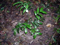 | Field notes | Acaulescent rosette-palm. Leaves 7 per stem; sheath 8cm long, open; petiole 24cm, margined, green; rachis 12cm; lamina 20 x 19cm; pinnae 3 per side, basal 10cm, middle 11cm, apical 10cm. Sterile voucher. Transect HB344-SU85. |
