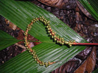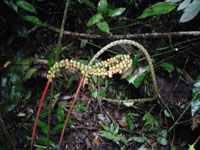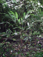 | Field notes | Solitary, short-stemmed, understory palm. Stem 0.3m long, 5cm thick. Leaves 11 per stem; sheath 25cm, open; petiole 93cm margined, green; rachis 65cm; lamina 95 x 37cm; pinnae 3 per side, basal 40cm, middle 40cm, apical 40cm. Inflorescence interfoliar; peduncular bract 35cm long, brown, inserted at the base; peduncle 72cm long, 0.5cm thick; rachis 40cm long, 0.7cm thick, unbranched; flowers sunken. Transect HB344-SU87. |
